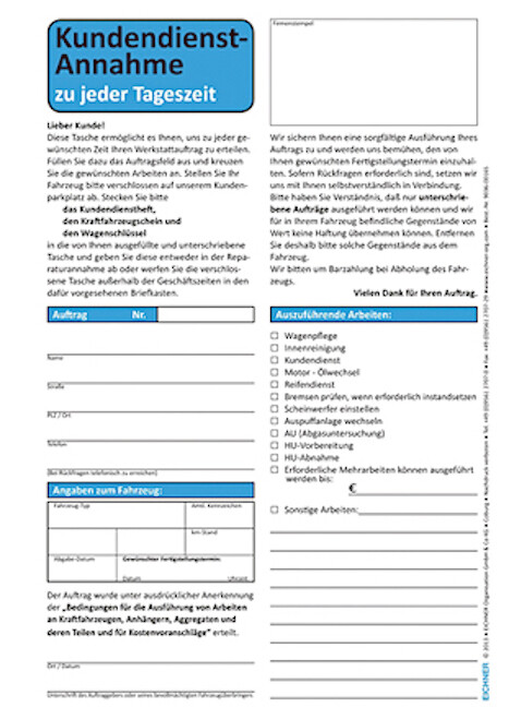 Auftragstasche und Werkstattauftrag für den Nachteinwurf von: Schlüsseln, Kfz-Papieren,…,