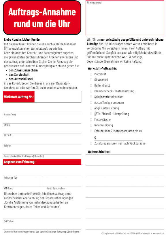 Auftragstasche und Werkstattauftrag für Österreich für die Auftrags-Annahme rund um die Uhr und für den Nachteinwurf von: Schlüsseln, Kfz-Papieren,…