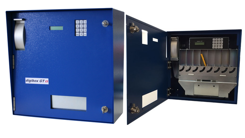 Serienmäßige Ausstattung der digibox GT: gesicherter Schlüsseleinwurf und ein großes gesichertes Schlüsselannahmefach; Sprachauswahl: Deutsch, Französisch, Italienisch oder Englisch. Bei Inbetriebnahme einfach eine der Sprachen aktivieren und diese Auswahl Bei Bedarf durch eine einfache Umstellung ändern; frei wählbarer Begrüßungstext;