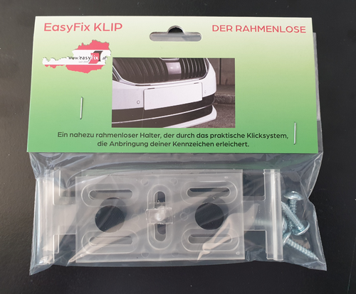 Der universell einsetzbare RAHMENLOSE KENNZEICHENHALTER EASYFIX Klip macht es möglich, ohne mühsames Durchbohren, schlicht und rahmenlos die Kennzeichen an Front & Heck völlig mühelos zu befestigen. 2 Klipp-Module für je 1 Kennzeichen (= 1 Paar), inkl. 2 verzinkten Linsen-Blechschrauben und 4 Moosgummi-Punkten. Aktuellen gesetzlichen Vorgaben entsprechend. Verpackt wahlweise in der Werkstattpackung (20 Klipp-Module für 10 Kennzeichen, Art.-Nr. KZH103W), oder in der Einzelpackung / Shop-Packung (2 Klipp-Module für 1 Kennzeichen, Art.-Nr. KZH103S) ausgestattet mit Reiter für die Regalbestückung. Werkstattpackung: Art.-Nr. KZH103W (für 10 Kennzeichen) Preis pro VPE ab 20 Paar (= 2 VPE) 60,00 €, ab 50 Paar (= 5 VPE) 55,00 €. Shop-Packung mit Reiter für die Präsentation im Regal: 1 Paar für ein Kennzeichen: 13,50 €, Preis pro Paar (für 1 Kennzeichen) ab 20 Paar 9.50 €, ab 60 Paar 8.50 €. Größere Mengen bitte einfach per Mail, info@easyfix.at, oder telefonisch, 01 9149073, anfragen. Das Team von EasyFix berät Sie gerne.