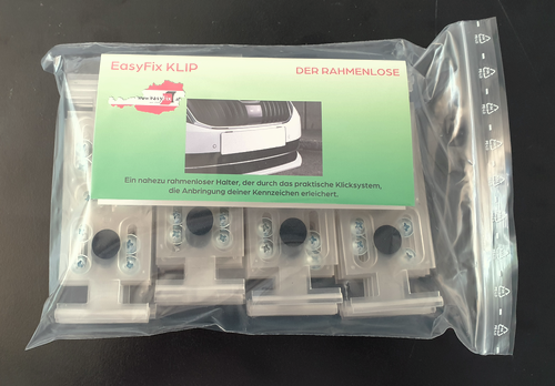 Der rahmenlose TRANSPARENTE Kennzeichenhalter EasyFix Klip stärt keine Sensoren, wie Parksensoren, Rückfahrwarner,…. und ist mit seinen 2,5 mm Radius und 5 mm Bautiefe AUCH AN DER KFZ-FRONT EINSETZBAR (Entsprechend BGBl. Nr. 399/1967). Einfache Handhabung – einfach Anschrauben und Kennzeichen einsetzen. Passend für alle einzeiligen Kennzeichen jeder Länge. In der ökonomischen Werkstattpackung (20 Klipp-Module für 10 Kennzeichen). VPE = 10 Paar für 10 Kennzeichen
