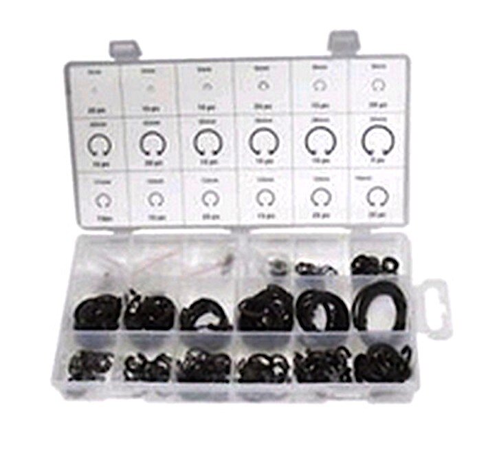 Sortiment Seegerringe in Größen von 3mm bis 32 mm übersichtlich sortiert.
