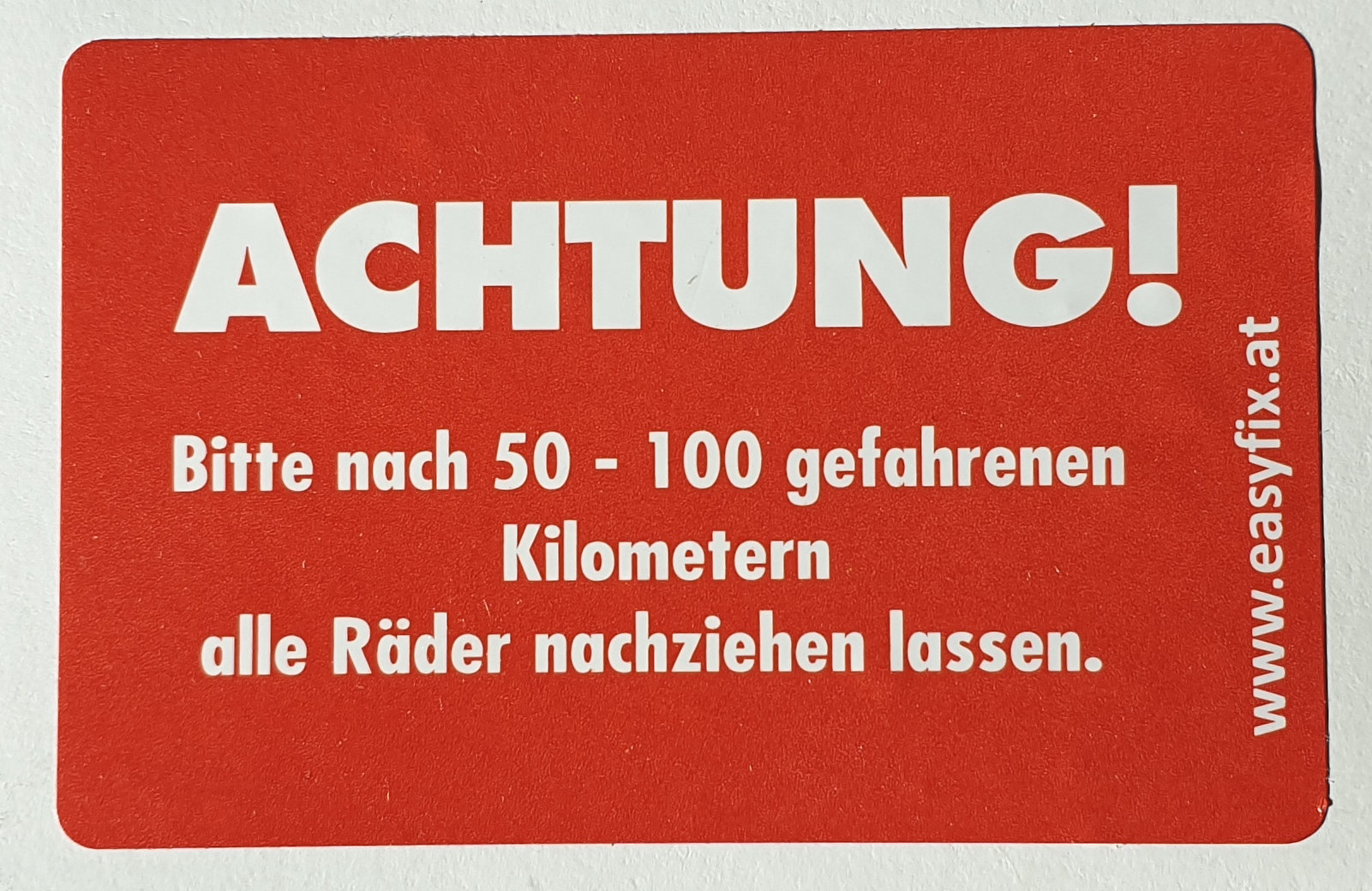 Kundendienstaufkleber „Achtung … Räder Nachziehen“