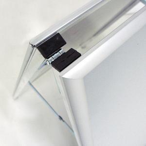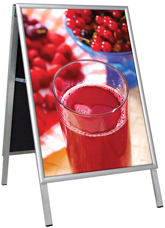 Doppelseitiger Kundenstopper mit stabilem Gestell aus Alu-Rechteckprofil und zwei aufmontierten 25mm Klapprahmen, mit schlagfester PS-Rückwand.