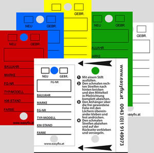Laminierte Schlüsselanhänger für die effiziente Organisation von (Auto-)Schlüsseln und Produkten.