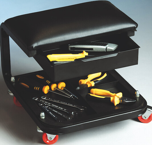 Rollhocker mit ausziehbarer Schublade inklusive Werkzeugablagen und geräuscharmen Lenkrollen mit Gummilauffläche. Belastbar bis max. 120 kg. Maße: 420 x 375 x 240 mm