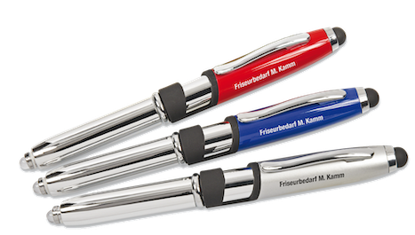 Formschön, handlich und praktisch: Kugelschreiber mit LED-Leuchte, Touch-Pen Funktion & („TV“-) Halterung für Smartphones.