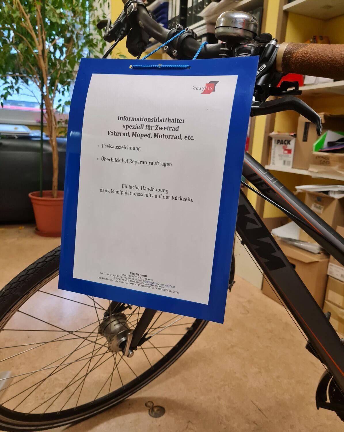 Preis-/Infoblatthalter speziell für Zweirad-Werkstätten und -Händler (Fahrräder, Mopeds, Motorräder,…).
