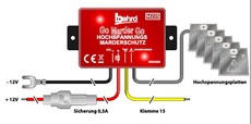 GoMarderGo Geräte mit Hochspannungsplättchen arbeiten zwar sehr stromsparend, sind aber dennoch mit einem Batteriewächter ausgestattet, der das Gerät, wenn die Batteriespannung unter ca. 11,5V (+/-5%) sinkt, sofort abschaltet, um die Stromversorgung des Fahrzeuges nicht zu gefährden.
